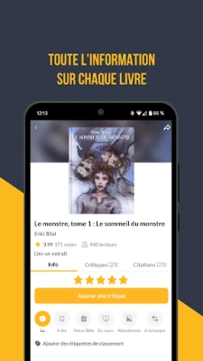 Exprimez-vous au sein d'une communauté de plus d'un million de membres. Partagez vos critiques, attribuez des notes et engagez le dialogue autour de vos lectures. Avec plus de deux millions d'avis déjà disponibles, parcourez les retours d'autres passionnés en toute sérénité grâce à la gestion des spoilers, ou sauvegardez vos propres brouillons pour peaufiner votre pensée. Identifiez qui apprécie vos contributions et connectez-vous avec des âmes littéraires partageant vos affinités. Babelio est l'endroit idéal pour élargir votre horizon, échanger des coups de cœur et tisser des liens autour de cette passion commune.