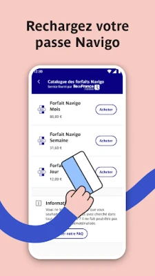 Dites adieu aux files d'attente et transformez votre smartphone en un guichet mobile. Acquittez directement vos titres de transport, des forfaits Navigo (Mois, Semaine, Jour) aux tickets individuels Métro-RER, Bus-Tram, ainsi que les billets spéciaux et Paris Visite. De plus, pour vos trajets courts ou vos envies de grand air, trouvez et réservez en quelques gestes un vélo Vélib', Lime, Dott ou Voi. Bonjour RATP regroupe toutes les clés de votre mobilité dans une interface claire, intuitive et ultra-performante.